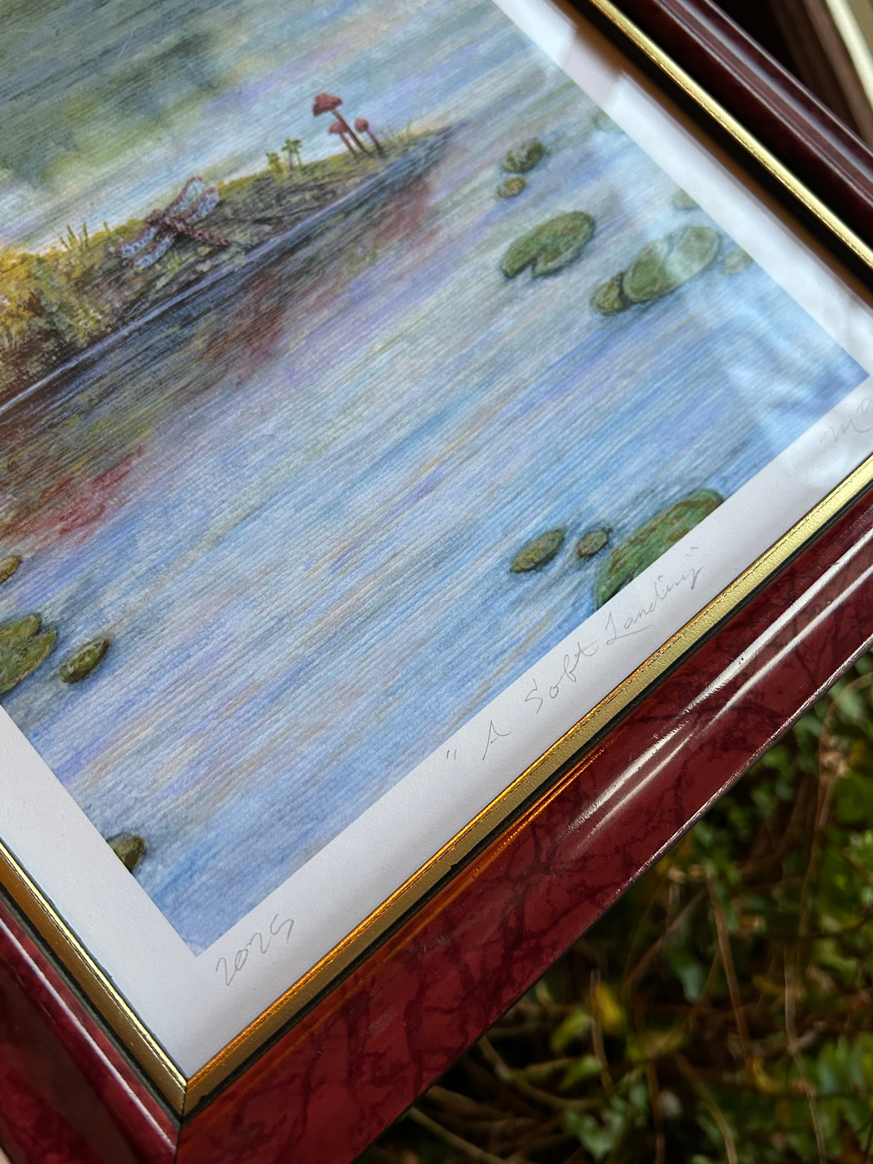 High quality 8x10 inch art print of my original dragonfly pond gouache painting in a red and gold frame.
